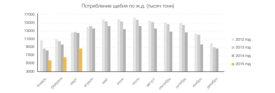 Споживання щебеню останніми місяцями демонструє позитивну динаміку. До прикладу, в березні показники по Росії збільшилися на 30,7% у порівнянні з лютим: споживачі отримали 8625, 5 тисяч тонн щебеню. Звичайно, це відчутно менше, ніж було в той самий період у 2014 році. Однак підйом споживання, який простежується зараз, дає надію на відновлення ринку щебеню.